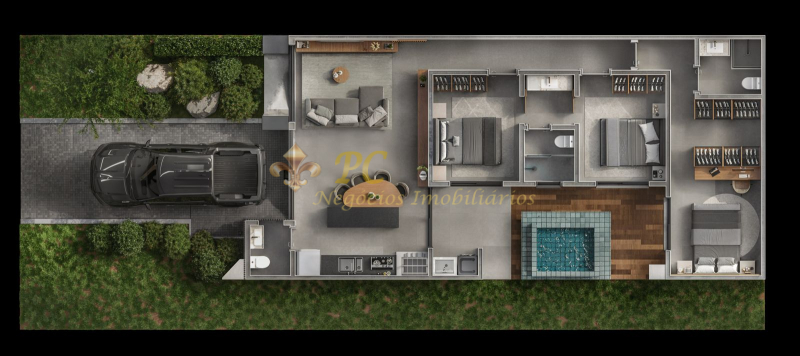As casas térreas com duas suítes e um lavabo terão área privativa de 77 m² e 6 m² de pátio, duas vagas de garagem (uma na rampa e outra em frente à casa), design com bolsão de ar entre as casas, proporcionando maior privacidade e ventilação natural, suítes com acesso direto ao pátio interno e infraestrutura para piscina.