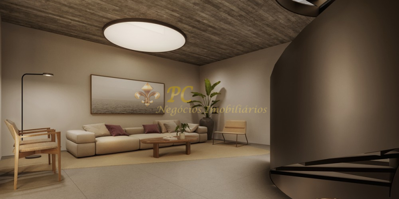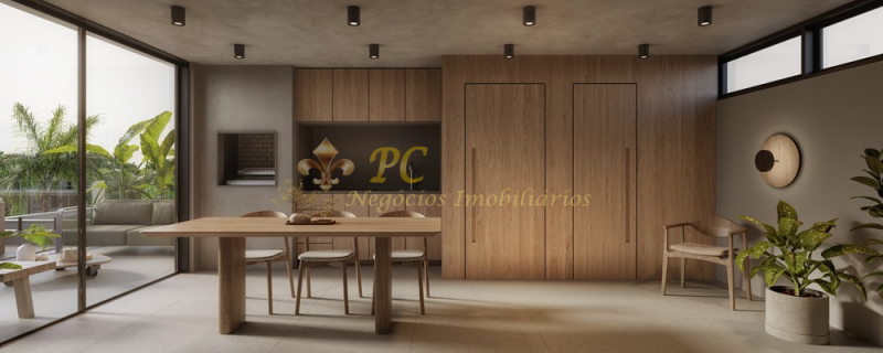 Living integrado com aberturas laterais, lavabo, churrasqueira, lareira, varanda, pátio, 3 suítes e rooftop com churrasqueira.