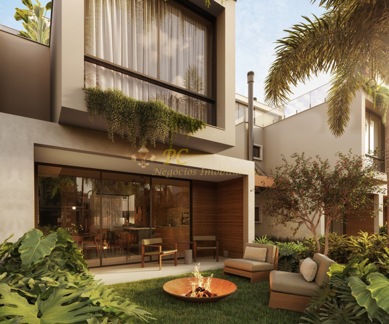 Living integrado com aberturas laterais, lareira, varanda, pátio, 3 suítes e rooftop com churrasqueira.