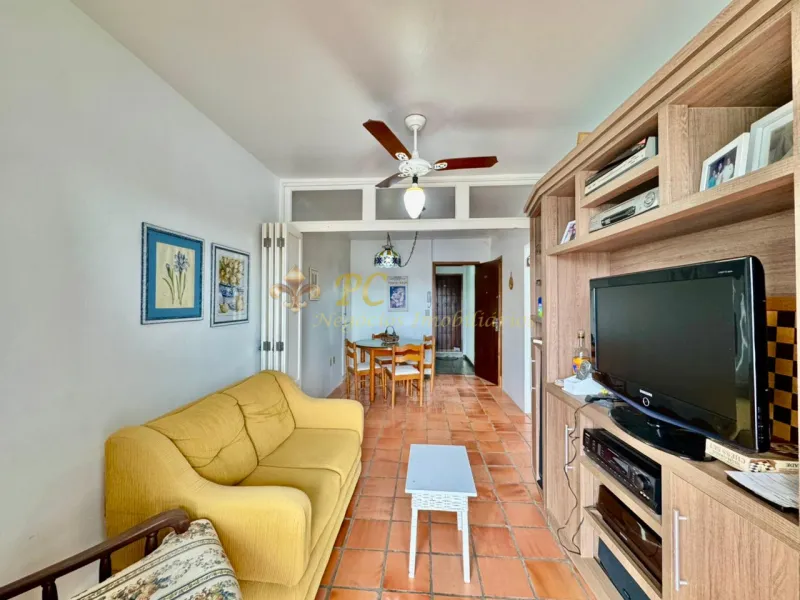 Apartamento de 1 dormitório, banheiro social, living estar, jantar com sacada, cozinha, churrasqueira.