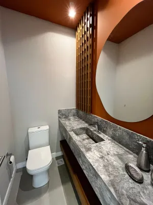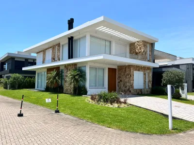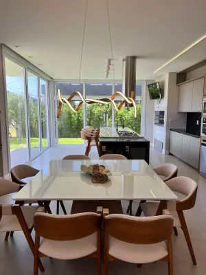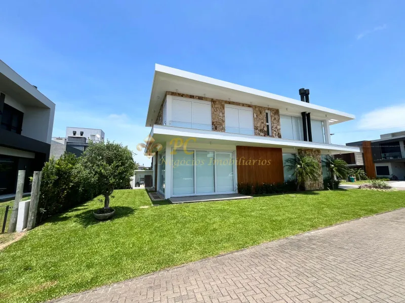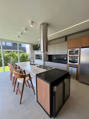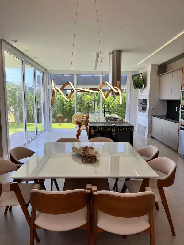 Sobrado no condomínio Blue - Casa Harmonia - com 04 suítes amplas, excelente living integrado com 65,08 m², lareira e churrasqueira, área de serviço e depósito, sacada no pavimento superior e home office, 02 lavabos, sendo 01 próximo à área da piscina, esperas para aquecimento, esperas p/piscina, esperas para ar condicionado, revestimentos de alto padrão classe “a”, esquadrias em pvc com persianas motorizadas e vidros temperados. área privativa: 241,23 m²