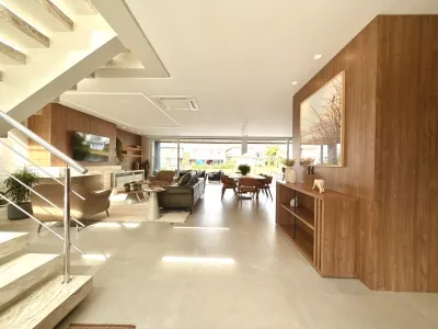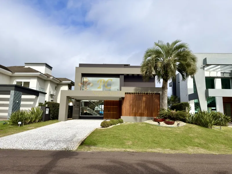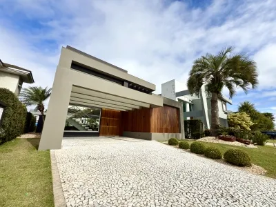 Lindo Sobrado no Condomínio Enseada Lagos, mobiliado, frente norte, beira lago, ótima localização, composto por 4 suítes, living em 2 ambientes, lareira, cozinha americana, churrasqueira, lavabo, área de serviço, varanda, piscina, pátio privativo, vaga para carros!
