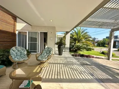 Casa toda térrea com 172,00m² de área construída, composta de 3 suítes, living 3 ambientes , lareira , lavabo, cozinha americana com churrasqueira , toda climatizada, varanda frente oeste, mobiliada e decorada