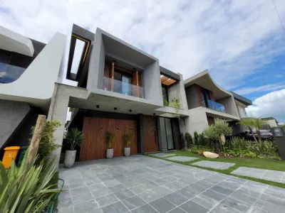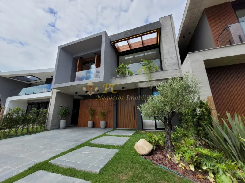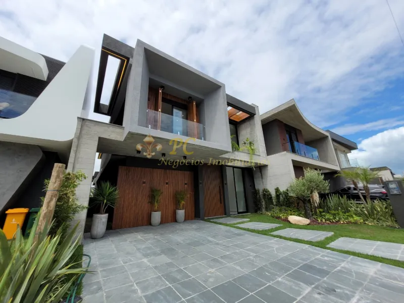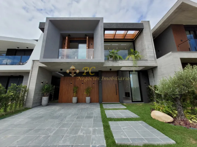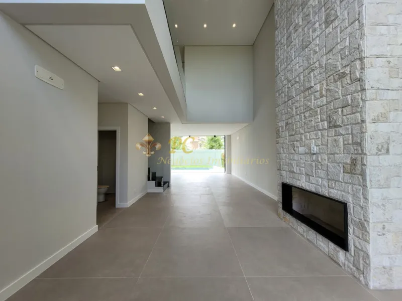 Sobrado frente norte no condomínio Sunset com 4 suítes independentes, sendo 1 suíte térrea, living 2 ambientes, lareira, lavabo, cozinha integrada com churrasqueira, lavanderia, entregue com piscina em concreto, vaga para 2 carros, sem móveis soltos e fixos.