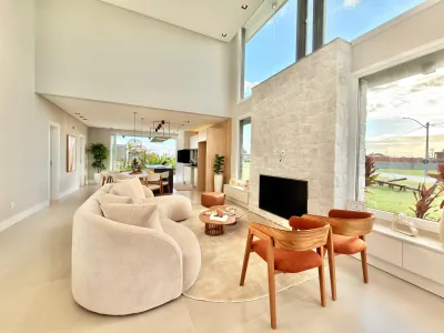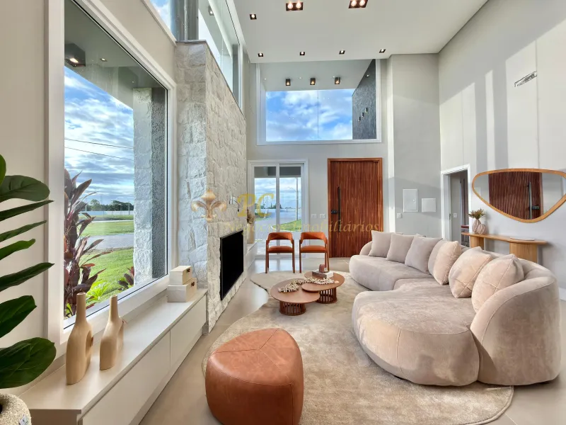 Casa térrea no condomínio Allure Beach Condo com 150m² de área construída e o terreno com 249,30 m² de área total, localizada ao lado da área verde, 3 suítes, mobiliada e decorada, lavabo, living 3 ambientes, lareira, espaço gourmet, lavanderia, revestimento em pedras naturais, garagem para 2 carros, frente norte.