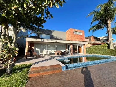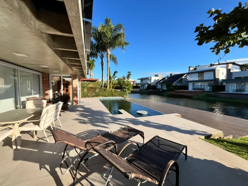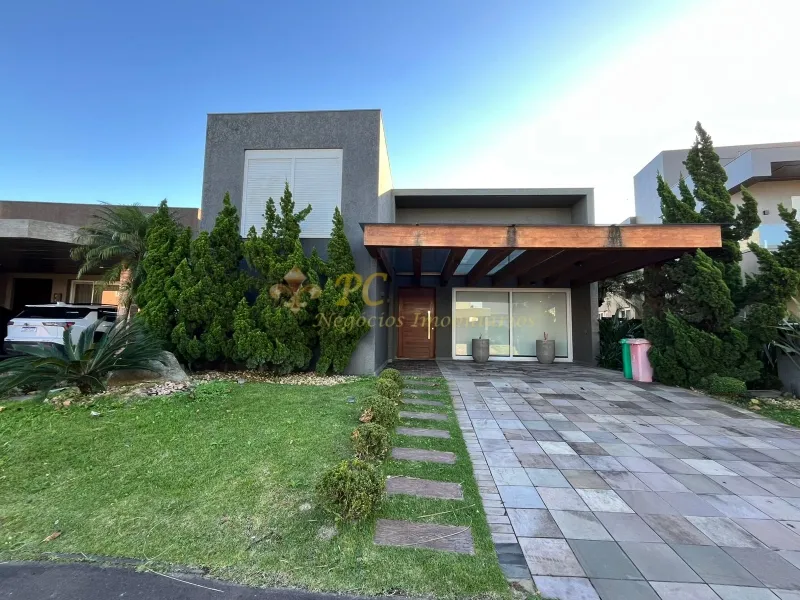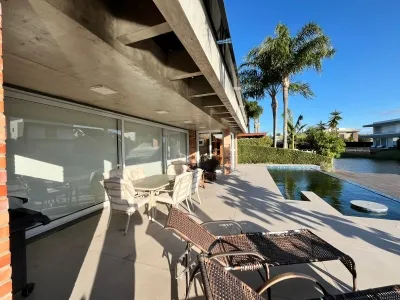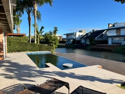 Sobrado beira lago no Condomínio Malibu, orientação solar frente leste, com 4 suítes sendo uma com closet e hidro, lavabo, amplo living três ambientes, espaço gourmet, área de serviço, piscina e deck à beira lago com ótima orientação solar, mobiliada e decorada, garagem para dois carros, 300m² privativos, terreno com 437,99m².