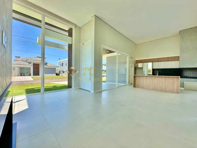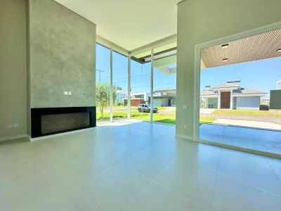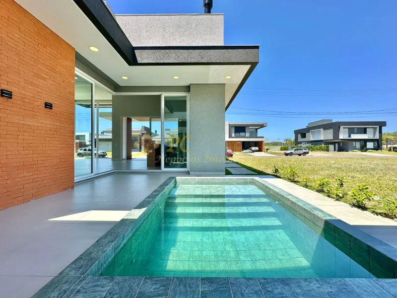 Casa Térrea, alto padrão, projeto moderno de estilo contemporâneo, composto por 04 suítes, sala de estar e jantar, cozinha americana com espaço gourmet e churrasqueira com a possibilidade de integração com a área de lazer externa através de esquadrias de abertura total, toda a área de living com pé direito duplo, piscina, garagem coberta para 2 carros e vagas descobertas para mais 2 carros, área de serviço e lavabo.