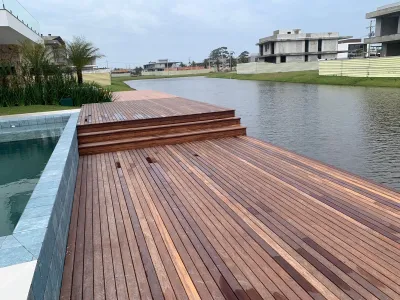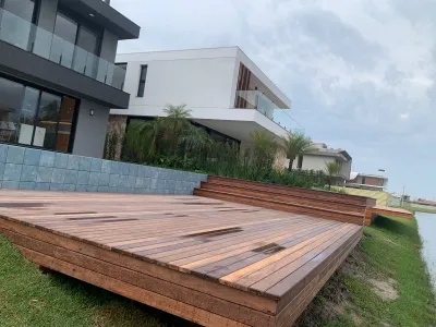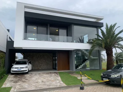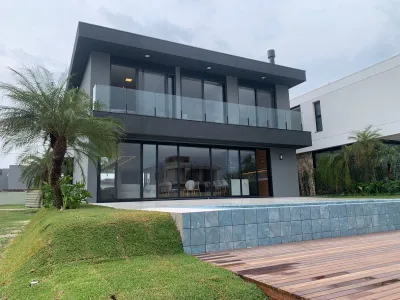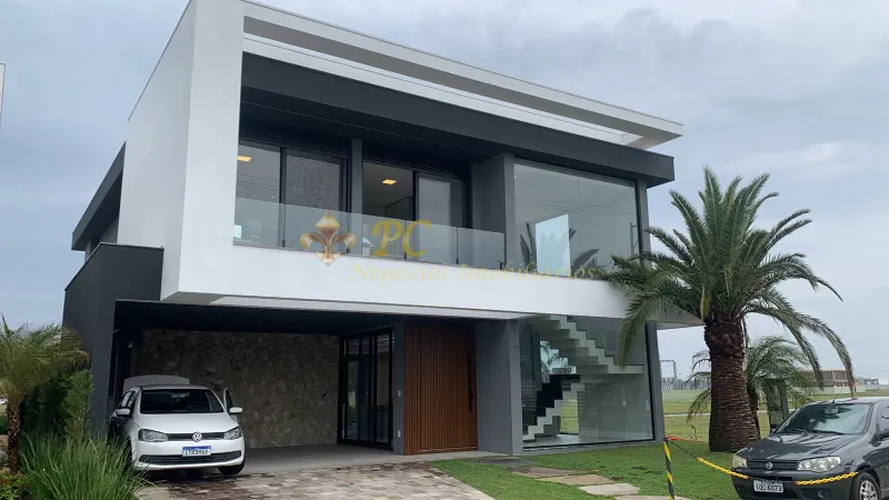Sobrado com 327,67m² distribuidos em 6 suítes, sendo 1 térrea, living conceito aberto 3 ambientes c/lareira , lavabo , integrados com espaço gourmet c/churrasqueira , varanda com piscina de concreto e deck a beira lago , paisagismo, mobiliado.