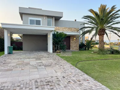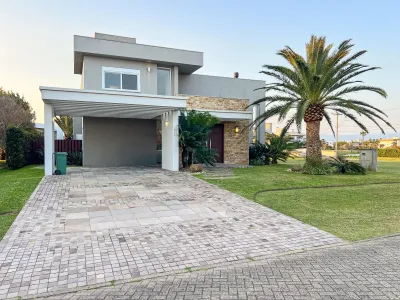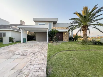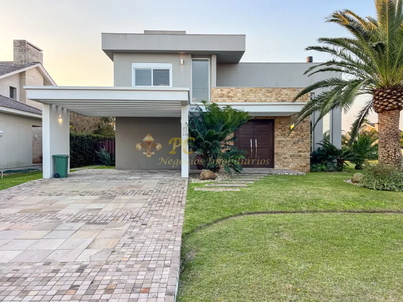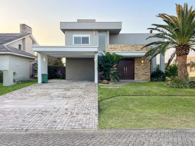 Sobrado beira lago, mobiliado e pronto para morar. Conta com 04 suítes independentes, living integrado em 03 ambientes, lareira, lavabo, cozinha completa, churrasqueira, área de serviço e lavanderia. Possui ainda vagas para 04 carros e piscina de concreto aquecida, ideal para desfrutar momentos únicos em um ambiente sofisticado e acolhedor.