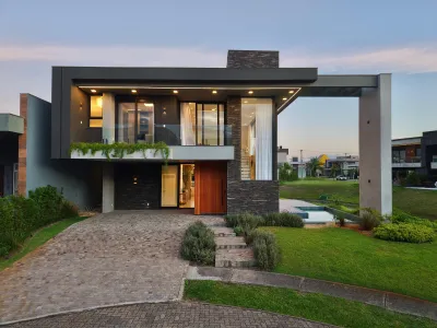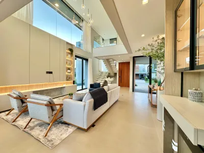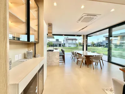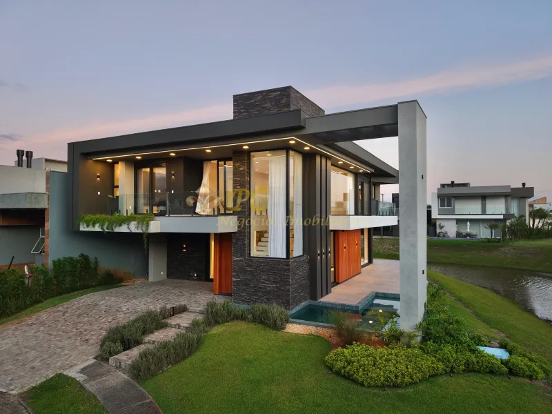 Sobrado em terreno de esquina leste-sul à beira lago , excelente ventilação e iluminação natural , com 389,00m² de área construída distribuídos em 5 suítes, sendo 1 térrea, amplo living 4 ambientes com lareira , lavabo, estar jantar integrados com espaço gourmet , piscina de concreto, paisagismo, finamete mobiliado e automação sistema ALEXA.