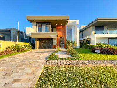 Sobrado com 417,00m² de área construída em terreno com 560,00m² privativos ( 16 x 35 ) excelente orientação solar frente norte com ventilação natural , distribuídos em 5 suítes , sendo 1 térrea, amplo living 4 ambientes com lareira , lavabo , estar e jantar integrados com espaço gourmet , piscina de concreto, paisagismo, placas solares , sistema ALEXA de automação, finamente mobiliado e decorado.