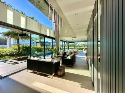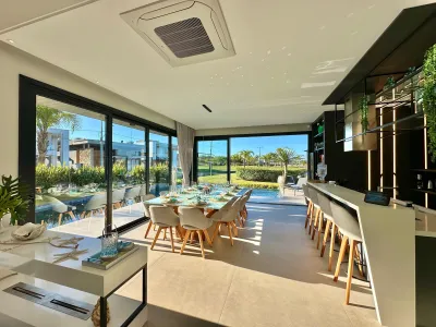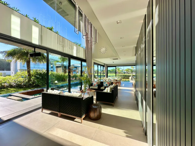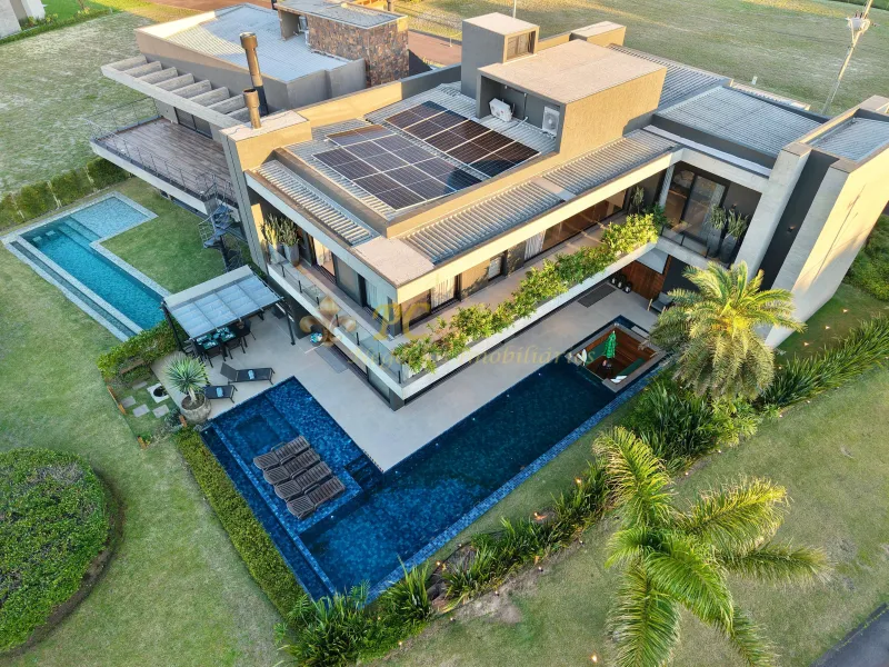 Paisagismo assinado pela Recanto Tropical com 07 grupos de irrigação automatizados com 2 poços de água sem a presença de ferro! Piscina de concreto com borda infinita, raia para natação, 80m³ de água aquecida, área molhada com espreguiçadeiras, espaço de hidromassagem e sala de entretenimento com telão retrátil e sistema de som! Toda a residência é amplamente automatizada, com controle via smartphone e assistente virtual Alexa. Área de uso comum 722,90m² e 370m² de casa mais varanda e sacadas, Terreno esquina 544,04m² vista lago e área verde.