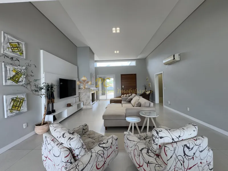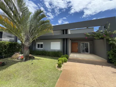 Casa beira lago e com um projeto moderno no Condomínio Riviera, com 04 suítes, amplo living com 02 ambientes, Lareira, pé-direito duplo, Cozinha, Americana com churrasqueira, Lavanderia, Área de serviço, Finos acabamentos, orientação solar frente sul, metragem privativa 190m² e área total do lote 360m².