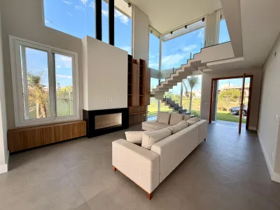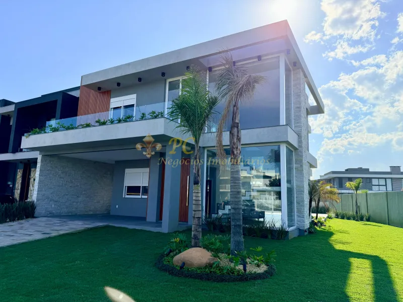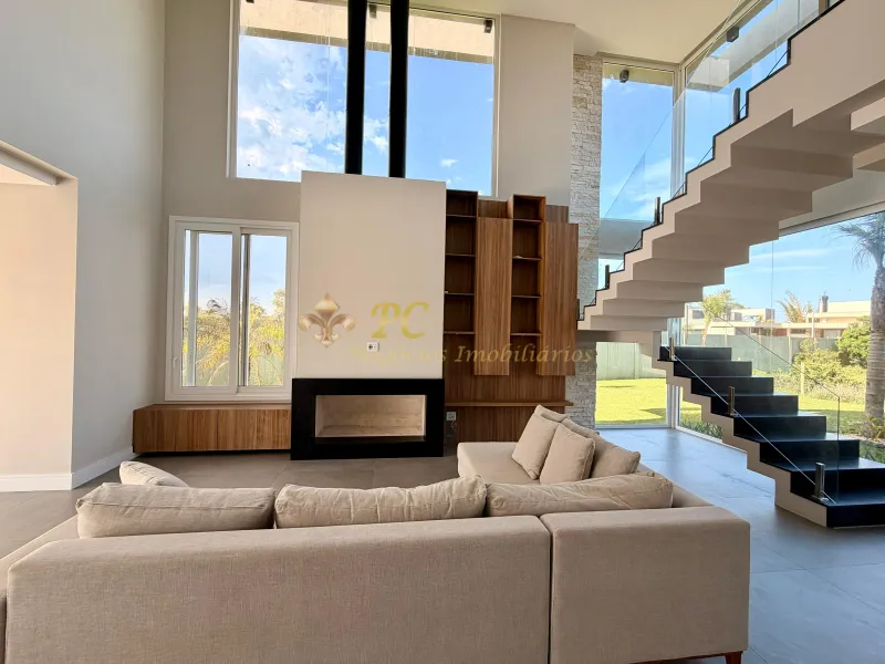 Sobrado no Condomínio Sunset com 04 suítes, lavabo, living integrado, cozinha com churrasqueira, lareira, piscina, 02 vagas de garagem, metragem total 307,89m² e área privativa 232,56m², orientação solar frente esquina leste/norte.