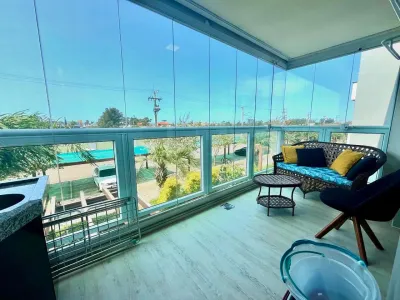 Apartamento Giardino no Condomínio Rossi, com 1 dormitório, 1 banheiro, living, sacada fechada, churrasqueira, cozinha americana e lavanderia, Vaga de garagem, 57m² área privativa, orientação solar frente leste.