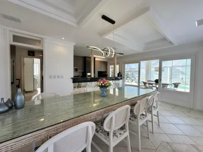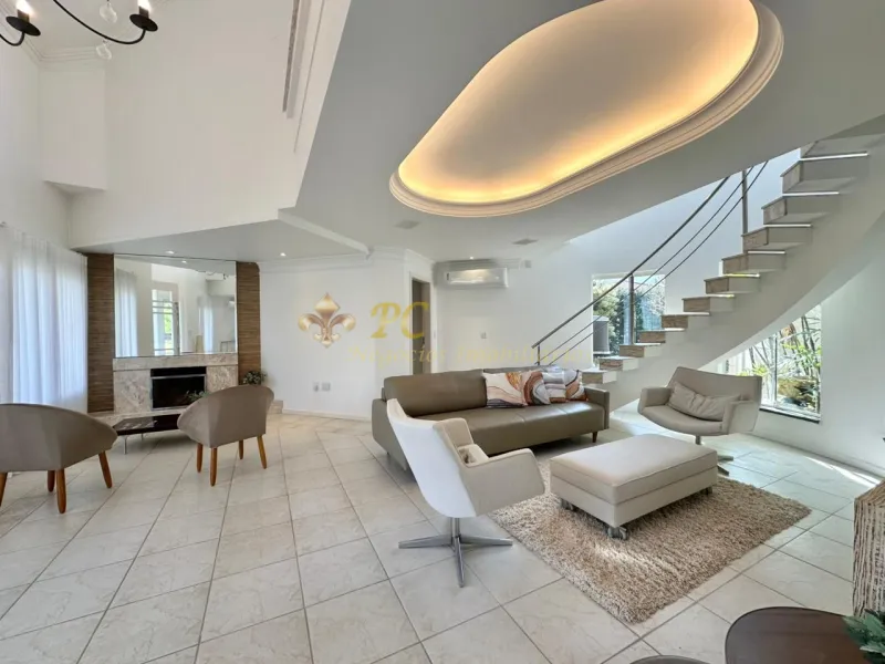 Sobrado no Condomínio Lagos Park, com 428m² em um terreno e meio, 04 Suítes , 01 térrea, Lavabo, Mobiliada, Cozinha, Lavanderia, Dispensa, Dependência completa, Lareira, Living integrado, Excelente iluminação Natural, Espaço gourmet independente da casa, Piscina, Abrigo fechado para 2 carros, orientação solar frente sul.