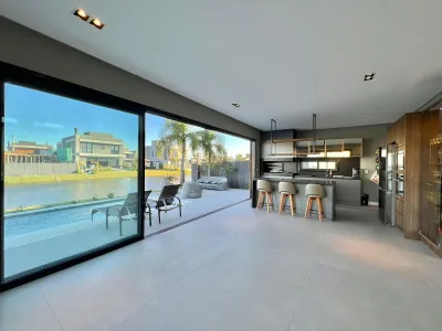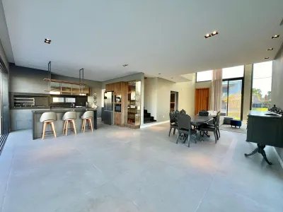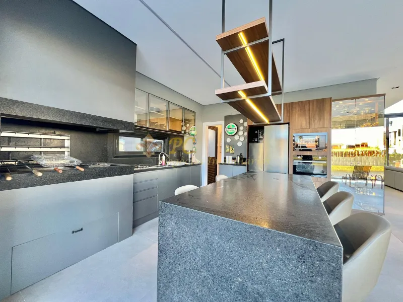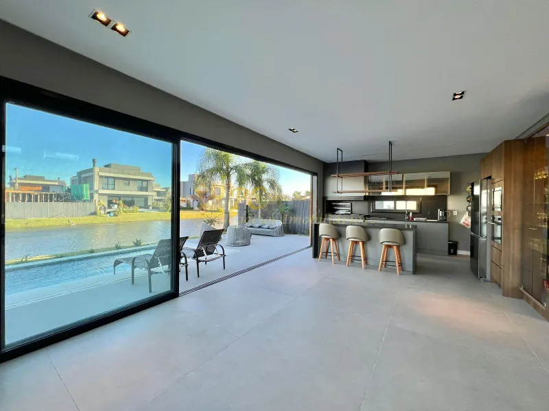 Sobrado beira lago com vista para a natureza. Possui 4 suítes espaçosas, living amplo com 3 ambientes, lareira, espaço gourmet com churrasqueira e piscina com vista para o lago e a serra. Frente norte, totalmente mobiliado e decorado, com 2 vagas de garagem e paisagismo exuberante.