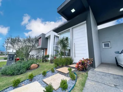 Casa térrea, beira lago no Condomínio Capão Ilhas composta por 4 suítes, totalmente mobiliada, Split instalados, living integrado, persianas automatizadas, lareira, churrasqueira motorizada, iluminação externa, jardim com oliveira, piso porcelanato, piscina aquecida (aquecimento solar), deck, 2 vagas de garagem, orientação solar frente leste.