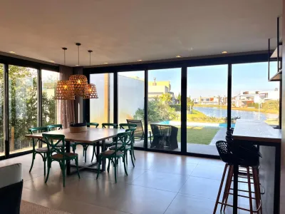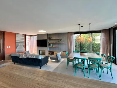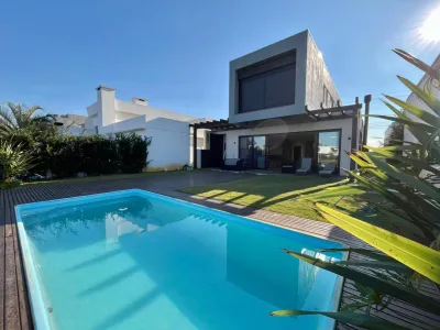 Sobrado Com área de 183,25m2, beira lago, esquadrias de alumínio preto com persianas motorizadas, 4 suítes, lavabo, amplo living 2 ambientes, mobiliada e decorada, a piscina com Deck, pergolado, irrigação e paisagismo.