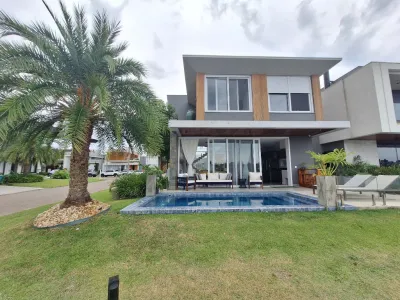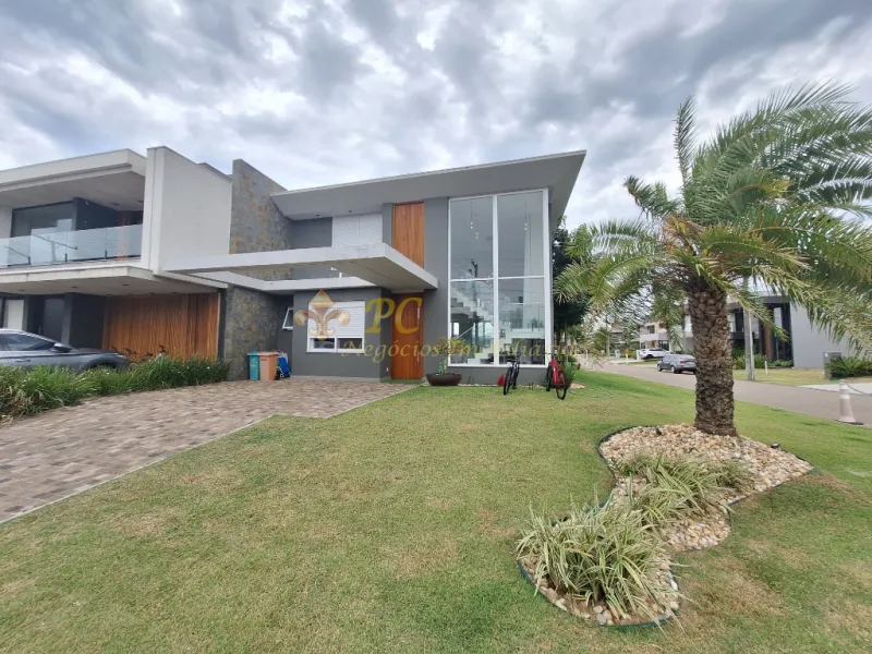 Beira lago, mobiliado e decorado, o imóvel conta com 4 suítes independentes (sendo uma térrea e uma suíte master com hidromassagem), living em dois ambientes com lareira, lavabo, cozinha integrada com churrasqueira, lavanderia e sacada.