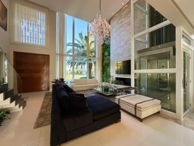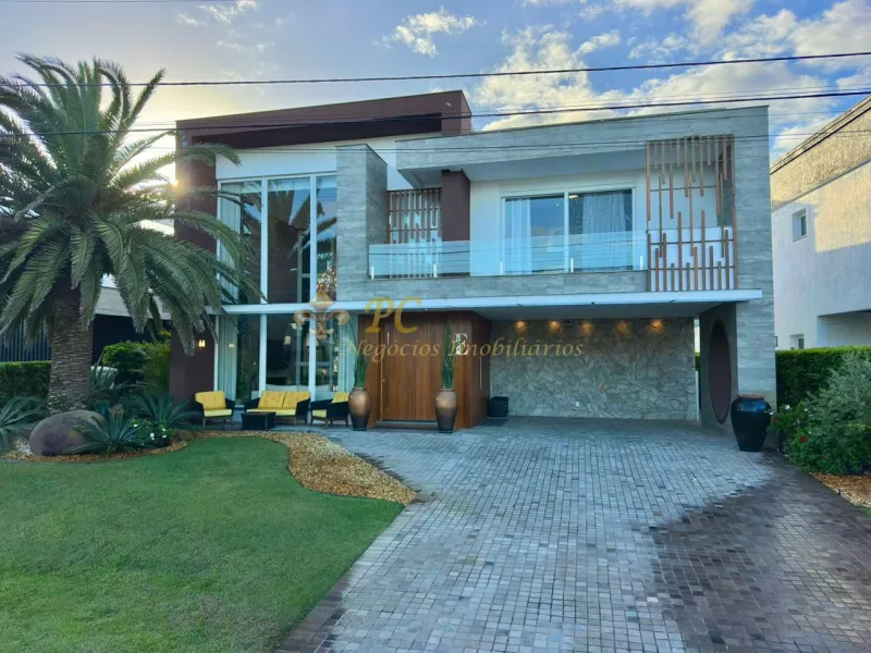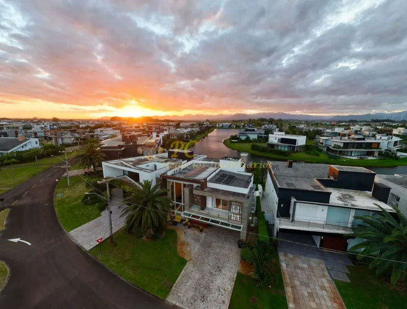 Sobrado no Condomínio Enseada na Praia de Xangri-Lá, beira lago, composto por 04 suítes, sendo 01 master, living integrado, lareira, cozinha com churrasqueira, mobiliada e decorada, pé direito duplo, piscina aquecida, lavabo, elevador, deposito, duas vagas para carro, com a melhor orientação solar frente Leste, 346m² privativos, 463,99m² totais.