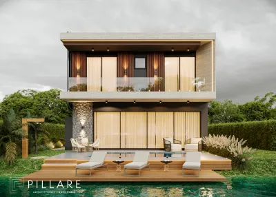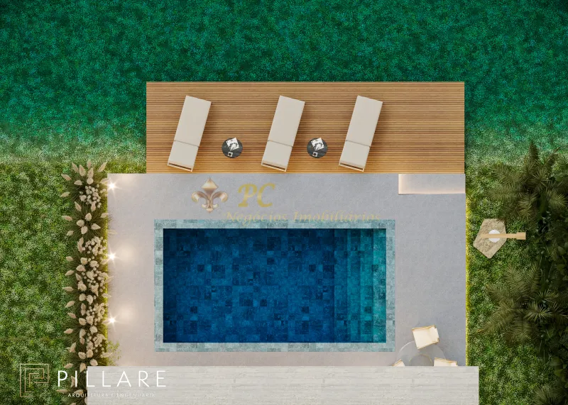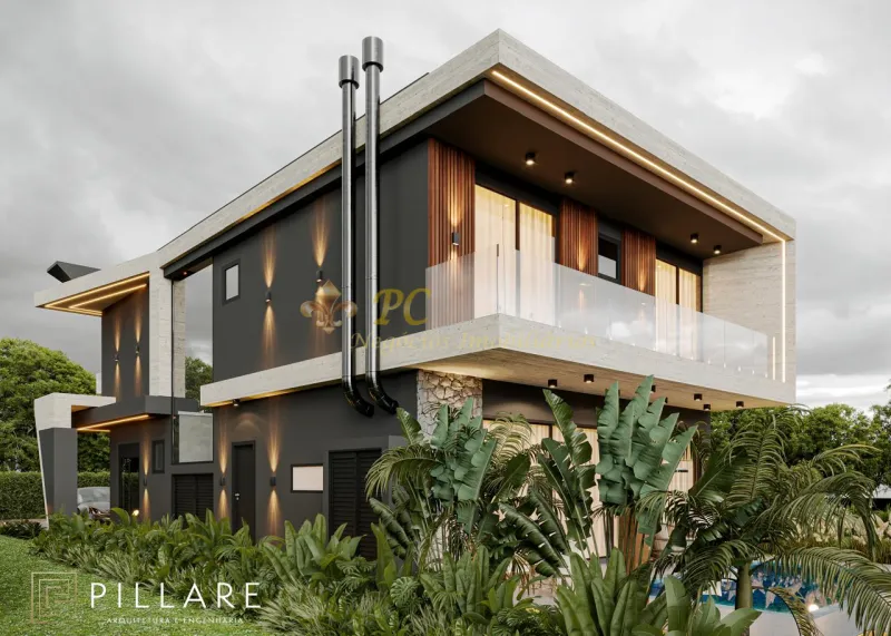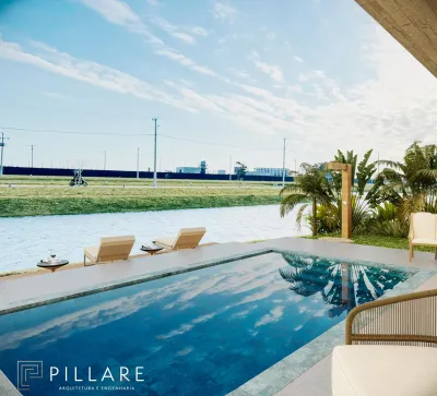 Sobrado com 4 suítes, lavabo, living amplo 3 ambientes. Entregue com automação, Espera para carregador de carro elétrico, Espera para placas fotovoltaica, Persianas automatizadas, Beira lago, Deck de madeira com iluminação em LED, com uma área de 14m², Piscina de concreto, com uma área total externa nos fundos de 60m². Paisagismo, Lareira de alvenaria, Churrasqueira interna, Piso porcelanato de 1,20 x 1,20, Esquadrias de PVC, com tela mosquiteiro. Entregue com iluminação externa, Acabamentos de alto padrão.