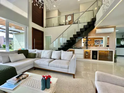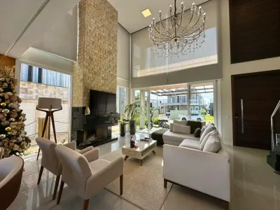 Sobrado no Condomínio Capão Ilhas Resort composta por 04 dormitórios sendo 03 suítes e possibilidade de uma quarta suíte, Amplo Living c/ pé direito duplo, sala de estar integrada com sala de jantar, Espaço gourmet, Lavabo, Lareira, Cozinha americana, Churrasqueira equipada, Lavanderia, Mobiliada, decorada e toda Climatizada, Piscina, 320m² construtivos, 343m² terreno, Beira lago, Abrigo para 2 carros, Depósito, Irrigação automatizada.