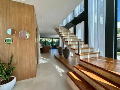 Sobrado à venda no Condomínio Porto Coronado, totalmente mobiliado e decorado, novo e nunca usado. Possui 257,25 m² de área construída em um lote de 315,95 m². Conta com 4 suítes, lavabo, banheiro externo, living integrado, revestimento em pedra moledo e acabamento em concreto aparente. O imóvel apresenta alto padrão em todos os detalhes, incluindo piscina, paisagismo, aberturas em PVC preto (Pedro Schwanck), persianas automatizadas com telas mosquiteiro e cortinas automatizadas.