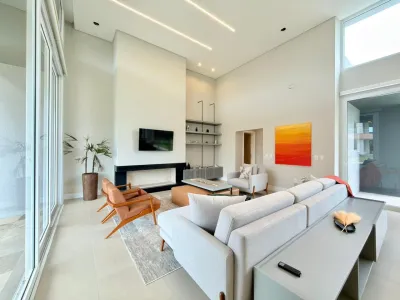 Casa no Condomínio Velas da Marina composta por 4 suítes, lavabo, nunca habitada, porte cocher na entrada, completamente mobiliada, decorada, todos os sanitários com ducha higiênica, living com pé direito alto, 100% integrado com gourmet, dependência de empregada completa, área externa com pátio amplo e piscina, banheiro na área de piscina, irrigação e iluminação no jardim, persianas automatizadas, orientação solar frente leste, 224m² privativos e 450m² totais.