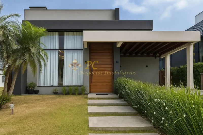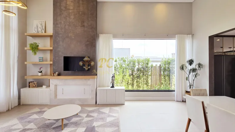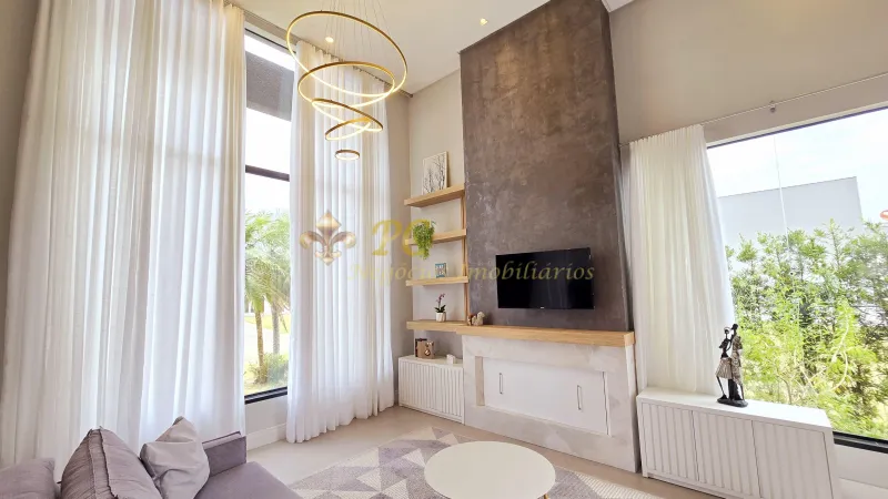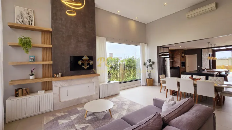 Casa no Condomínio Dubai composta por 4 suítes, sendo 1 com closet, lavabo, piscina aquecida, amplo living, climatizada, 2 vagas cobertas, área de serviço, lareira, churrasqueira com automação, mobiliada e decorada, jardim com iluminação. Ficam todos os eletrodomésticos, forno embutido na ilha, geladeira, micro-ondas, cooktop 5 bocas na ilha, 100% mobiliada. Área total do terreno 438m² e área construída 260m²
