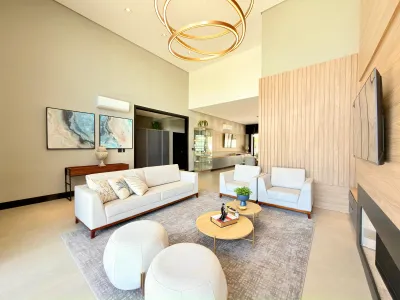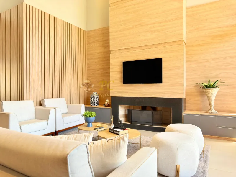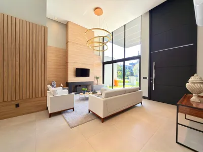 Casa no Condomínio Velas da Marina com 04 suítes individuais, lavabo, completamente mobiliada, decorada, living com pé direito alto, área externa com pátio amplo e piscina de concreto, persianas automatizadas, 254m² privativos.