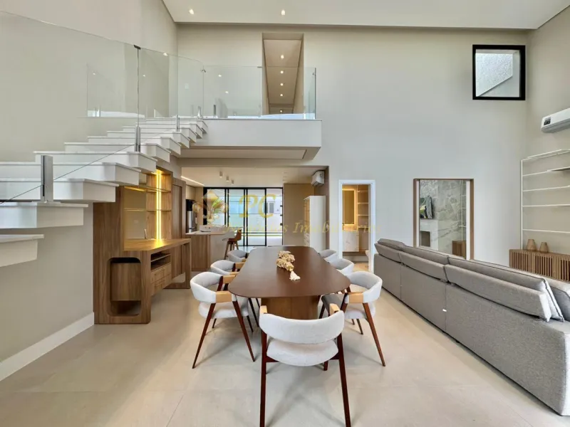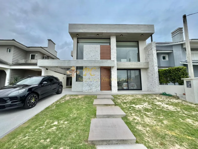 Sobrado no Condomínio Condado de Capão, são 05 suítes sendo a térrea máster, estar e jantar integrados, com 250 m², mobiliado e decorado, piscina aquecida, energia fotovoltaica, de frente para infraestrutura.