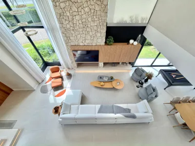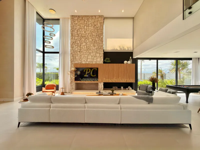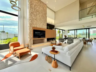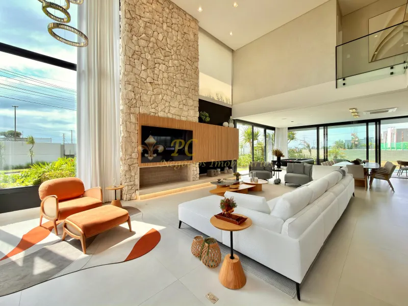 Mansão com 5 suítes no Condomínio Sense, sendo 1 térrea, uma master com um closet espetacular, living integrado, cozinha com churrasqueira, lareira, lavabo, piscina aquecida com hidro e de frente para o lago, mesa de sinuca, mobiliada, área de serviço com dependência. O terreno de esquina tem 537m² totais, já o sobrado 475m² privativos, é toda automatizada por alexa e conta com uma iluminação natural. Um diferencial em pedras, utilizada a modelo branca na decoração, uma pedra raramente vista na composição de ambientes, a escada toda revestida em Travertino Romano, assim como a bancada do lavabo.