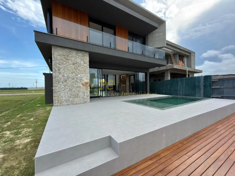 Na área externa, a casa possui piscina com deck e jardim, criando um espaço ideal para lazer e contemplação. A garagem atende com praticidade, e os acabamentos refletem alto padrão construtivo, com esquadrias pretas em alumínio, rebaixo em gesso no teto e materiais cuidadosamente selecionados.