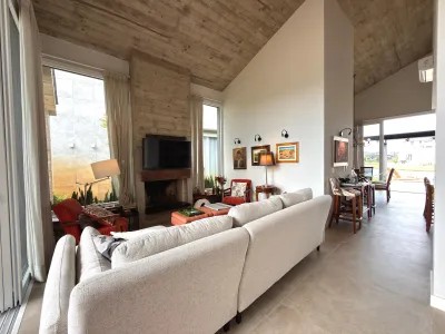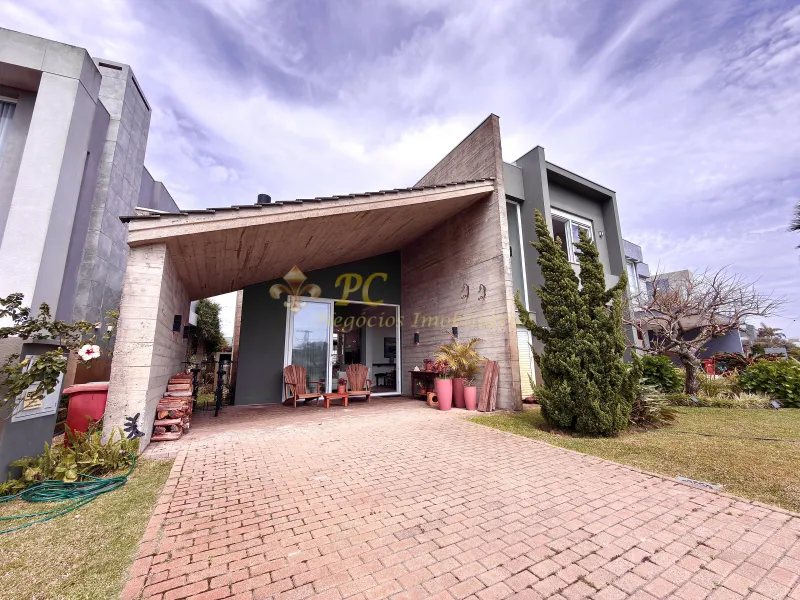 Casa à venda no condomínio Riviera em Xangri-Lá, localizada à beira do lago, com 4 suítes, living em 3 ambientes com lareira, lavabo, cozinha americana com churrasqueira, área de serviço, piscina aquecida, abrigo para 2 carros e semi mobiliada.