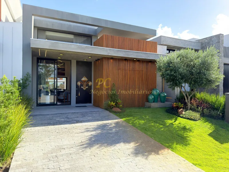 Casa com 04 Suítes, lavabo, living amplo, pé-direito duplo.. Aberturas Externas em Alumínio preto, piscina de concreto, paisagismo, persianas automatizadas, lareira, mobiliada e decorada.