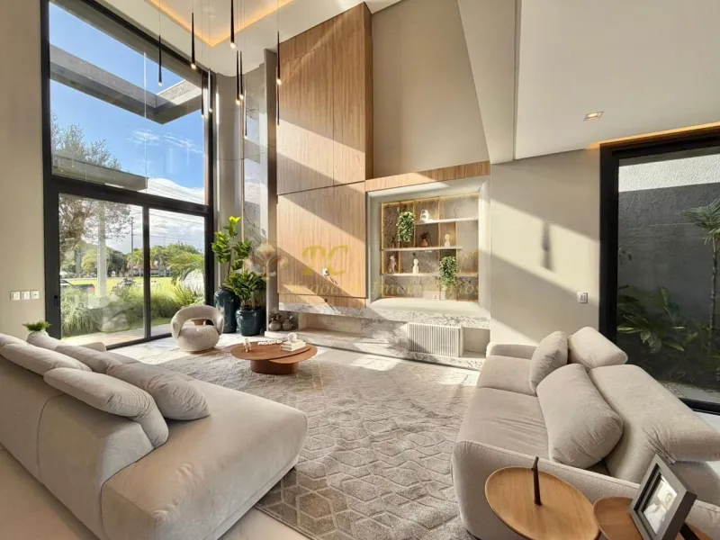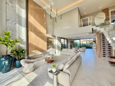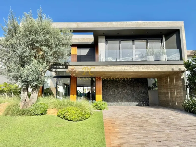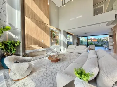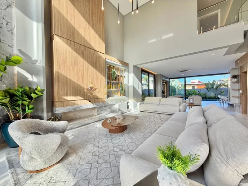 Sobrado no Condomínio Velas da Marina composto por 5 suítes, sendo 1 máster com hidromassagem,, closet e sacada frontal, living m pé direito duplo, piscina com banheiro privativo externo, esquadrias em pvc preto ( irmãos Schwank), projeto arquitetônico e decoração (Ednara Pioner), irrigação automatizada, projeto paisagístico - Recanto tropical, imóvel mobiliado, decorado e climatizado, sistema de automatização de luzes (teclas, cenas, alexa, app), som ambiente, estrutura (espera) para energia solar, área total privativa 403m².