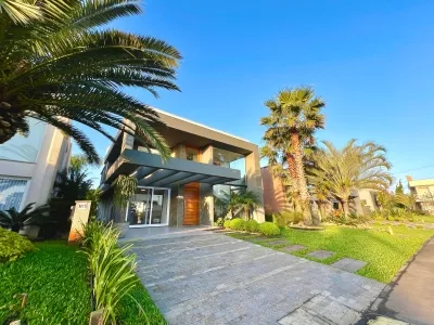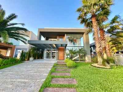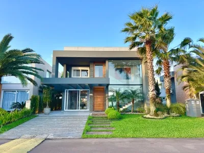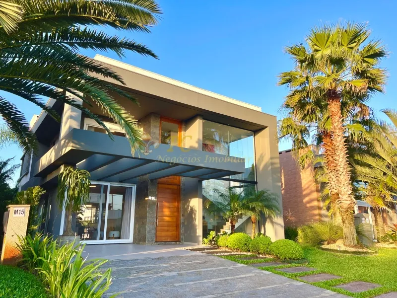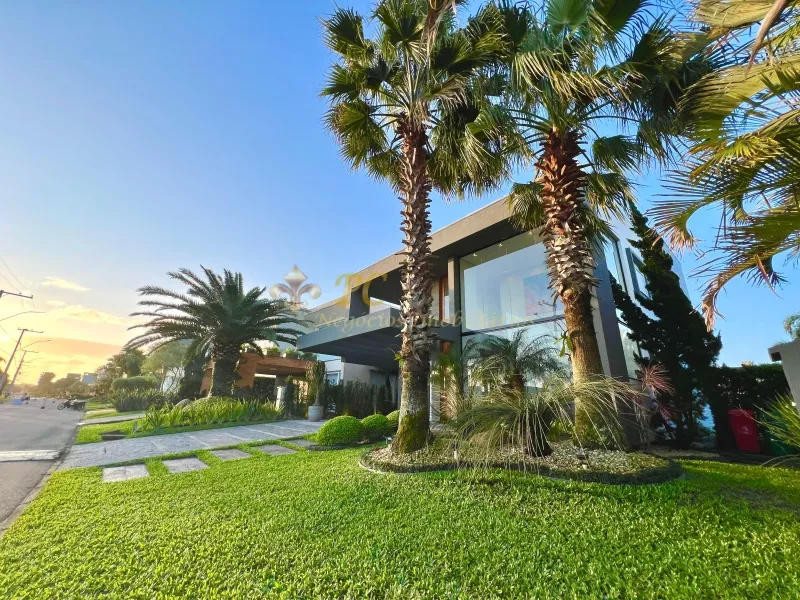Imóvel com altíssimo padrão construtivo no Condomínio Malibu, finamente mobiliado e decorado, aberturas em PVC, rebaixo em gesso, beira do lago e próximo ao clube do empreendimento, 5 suítes, sendo 1 térrea e 2 máster com banheiras de hidromassagem e sacada com vista para o lago, amplo living com lareira integrado em 4 ambientes, lavabo, cozinha com churrasqueira e balcão em ilha, dependência de empregada integrada a lavanderia, varanda nos fundos com vista para o lago, abrigo para 2 carros, piscina em concreto e deck em madeira, 264,69m² privativos e 401,94m² totais.